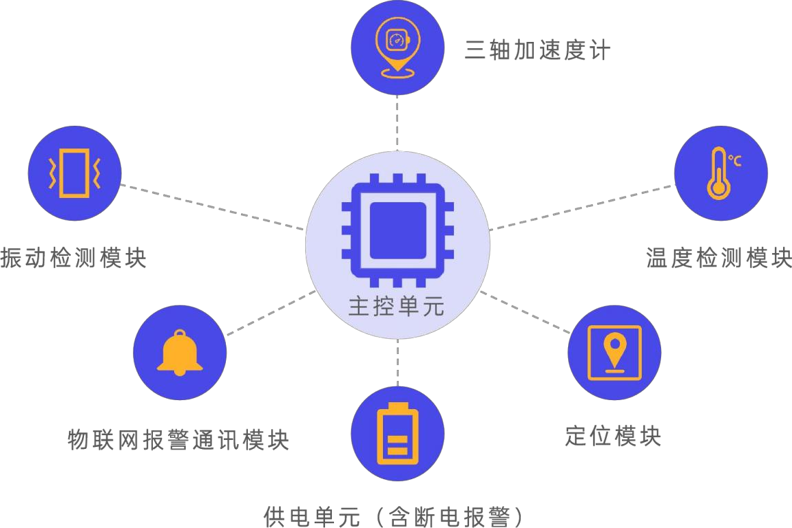 *主控單元:包括核心處理芯片,主要處理“終端”中加速度計、振動檢測模塊、定位模塊、物聯網報警通信模塊、供電單元返回的數據,可根據預設模式觸發報警、解除報警等;